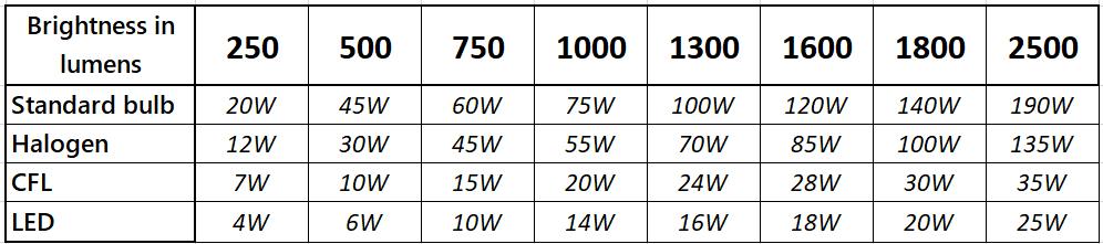 LED brightness is often measured in lumens, a rating of the direct light output of the bulb instead of the power consumption. This can make the comparison between traditional bulbs and LED replacements difficult, as few bulbs have a lumen rating and LED power consumption is considerably lower.